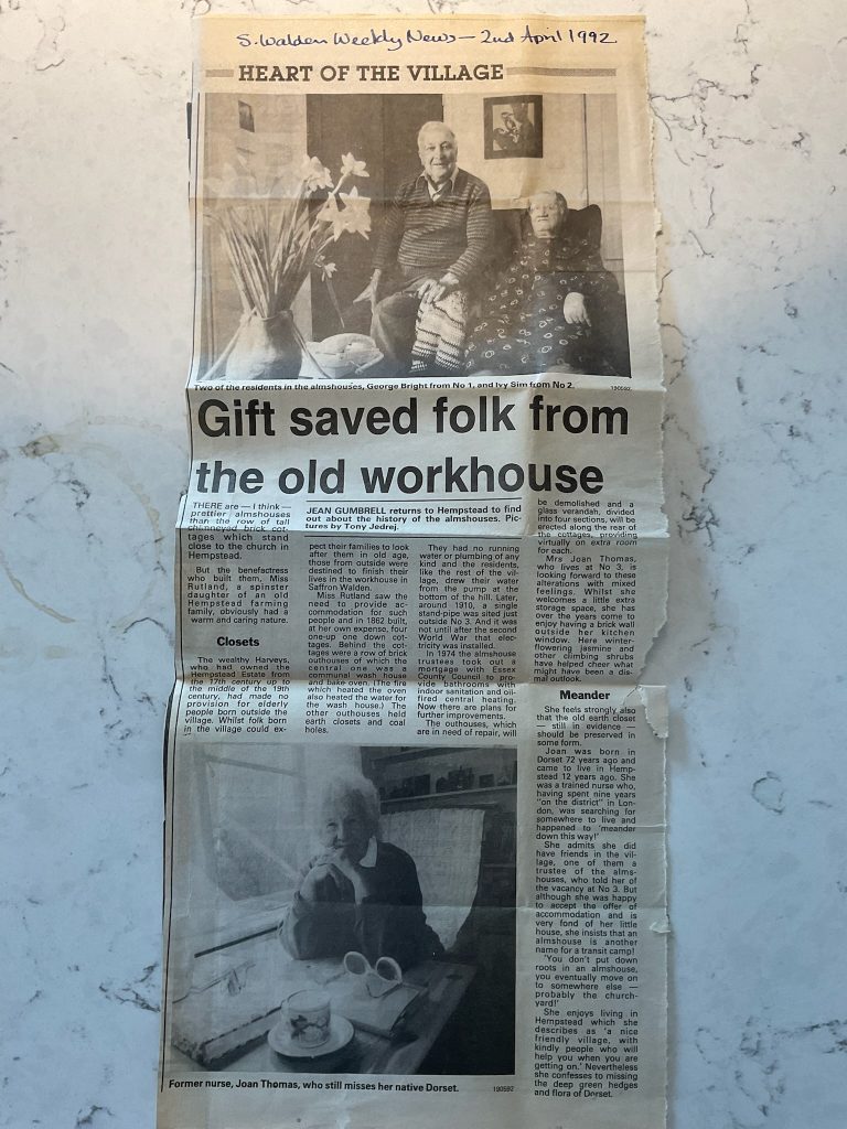 The Rutlands were an old Essex family who are recorded in and around Saffron Walden from about 1450. On 4 August 1803, George Rutland of Church Farm, married Harriet Lydia Green at St Andrew’s: they had four daughters. George died in 1832, leaving everything to his wife. In the 1842 tithe map, Harriet is recorded as owning about 25 acres of land to the north and east of Campions End, including Hawthorns and the farm which later came to be known as Philips Farm and which burned down in the 1920s. But she also owned a significant number of houses in the cenre of the village and farmed the several hundred acres of Church Farm, stretching from Wincelow Hall Road in the west of the village to the corner of Hempstead Wood in the east. When she died on 1 December 1859, she left an endowment to found the almshouses for older residents of Hempsteadwho are poor, invalid or infirm. The almshouses are still properly known as ‘Miss Rutland’s Cottages’.